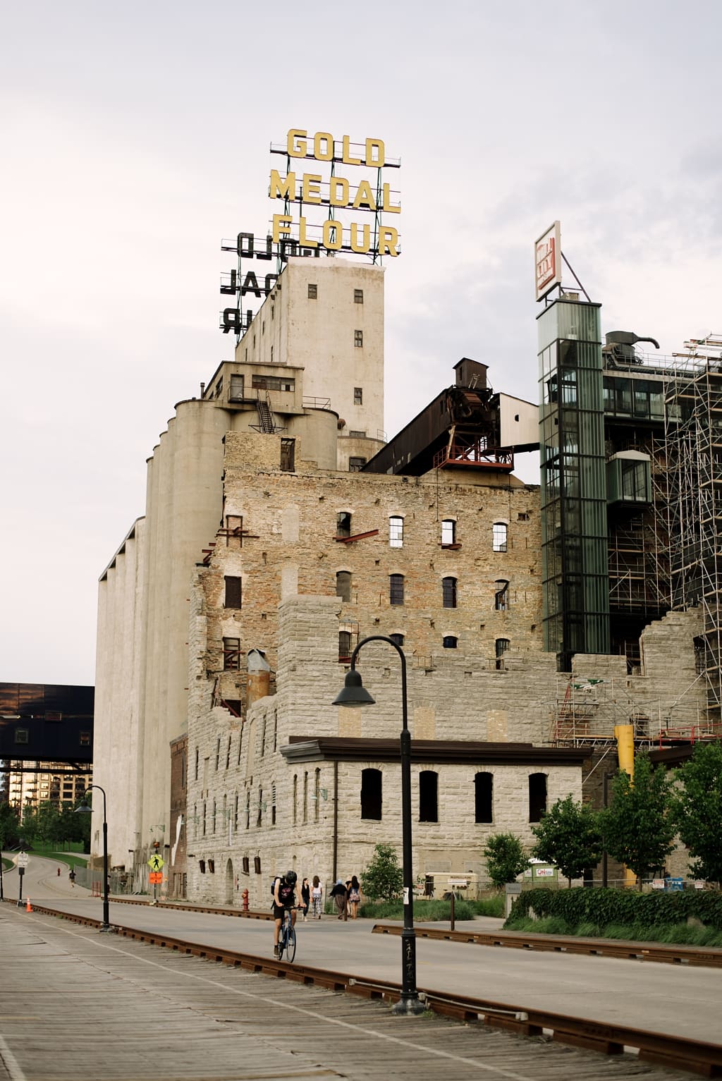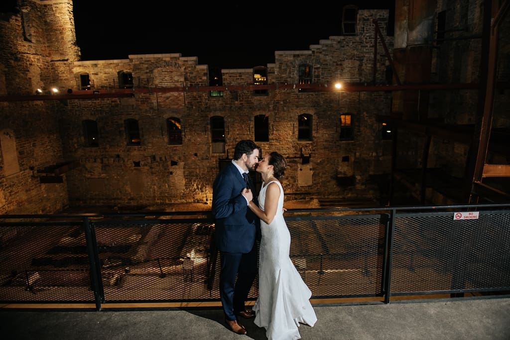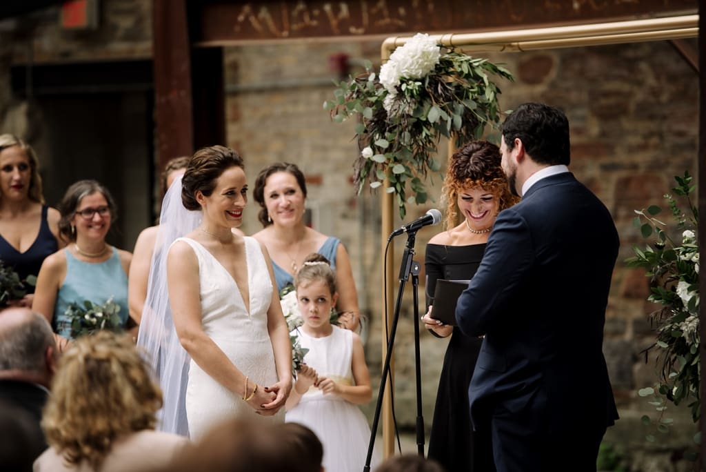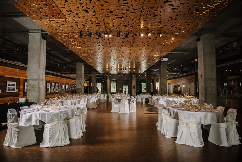 Venue: Mill City Museum, an industrial modern style wedding venue featuring an uncovered open-air ceremony area and indoor reception area.