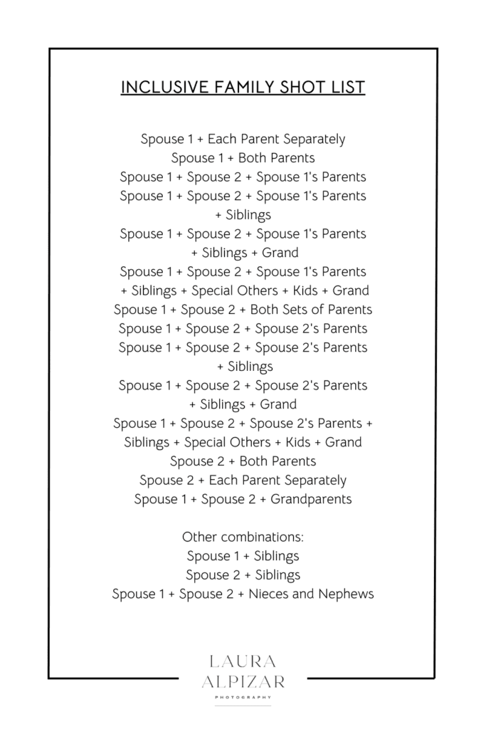 As many of my wedding couples are celebrating a more inclusive marriage, I have created this inclusive shot list. You can borrow some ideas or terms from here.