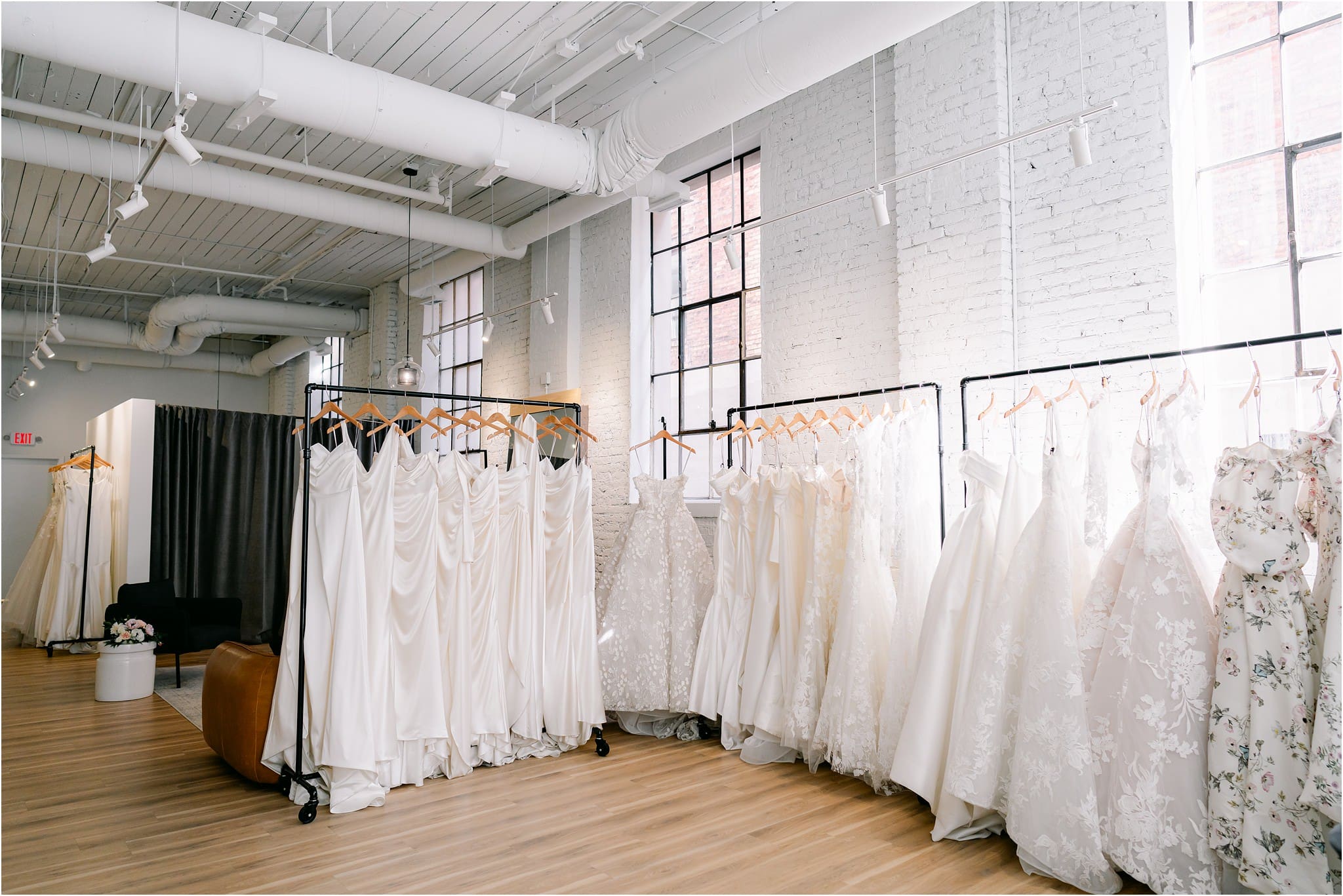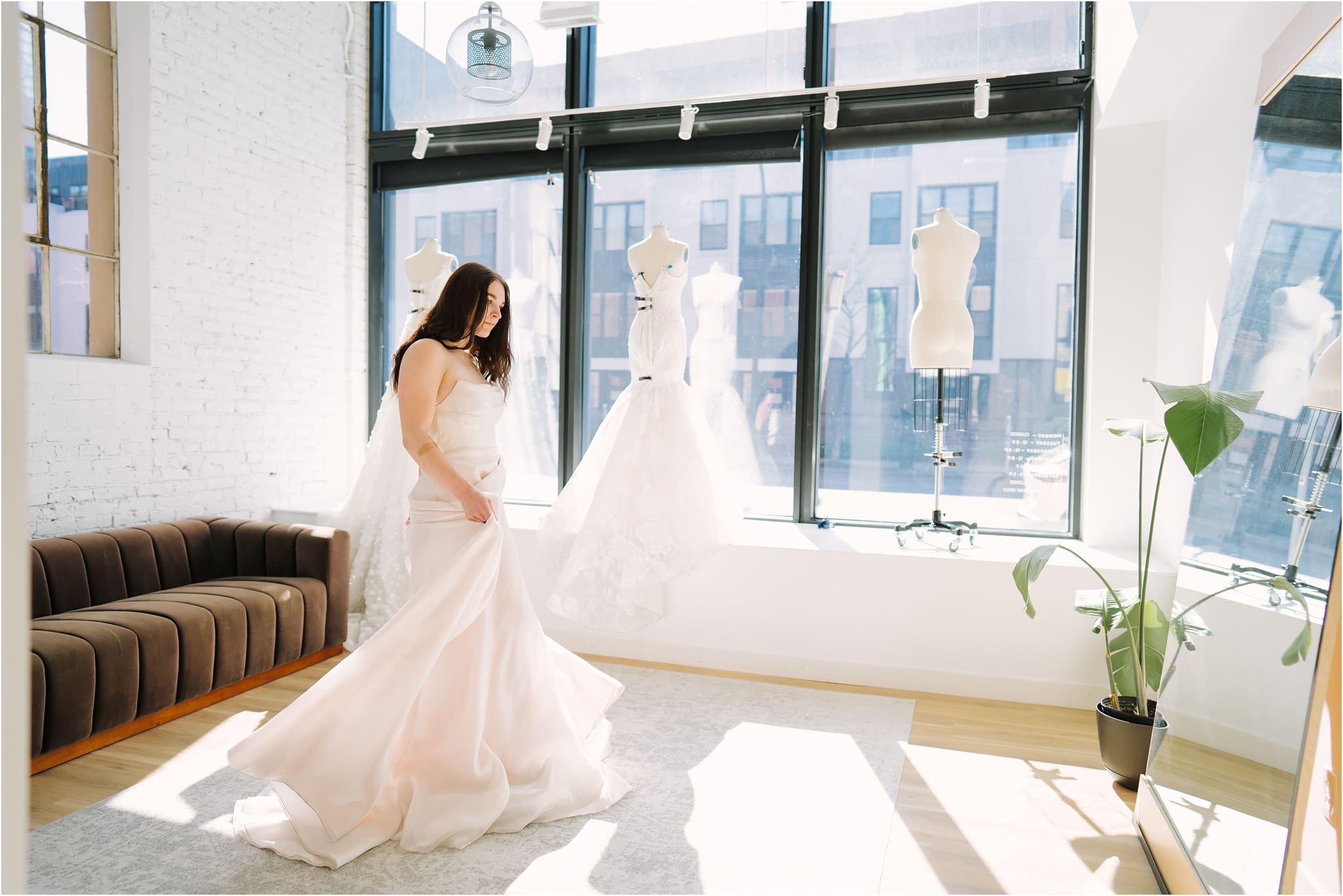 Anna bé was founded in Denver, CO in 2006 and opened up in the North Loop in 2021! There are currently three anna bé locations and ten a&bé locations. The Bridal shop we visited is located in the Northloop in Minneapolis. Anna Be is a sister store with a&bé Bridal in Edina. They are the same company but work with a different collection of designers. Anna bé is the laid back, luxury-focused older sister and a&bé is the whimsical, bubbly younger sister! We have so much fun when brides shop with both of us, but our collections are pretty different so a lot of brides will resonate with one brand over the other.