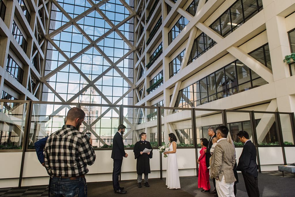 In Minneapolis, the Hennepin County Government Center serves as the main hub for courts and many legal proceedings, including civil marriage ceremonies. You can choose to get married in the Government center modern building, wether is a court room or the main lobby. You can also choose to get married in the Minneapolis City Hall historic building across the street. The City Hall is conveniently connected with an underground tunnel, and many judges will be open to walk over to the City Hall. Both these choices are a wonderful option for couples wanting a more spontaneous and intimate ceremony!